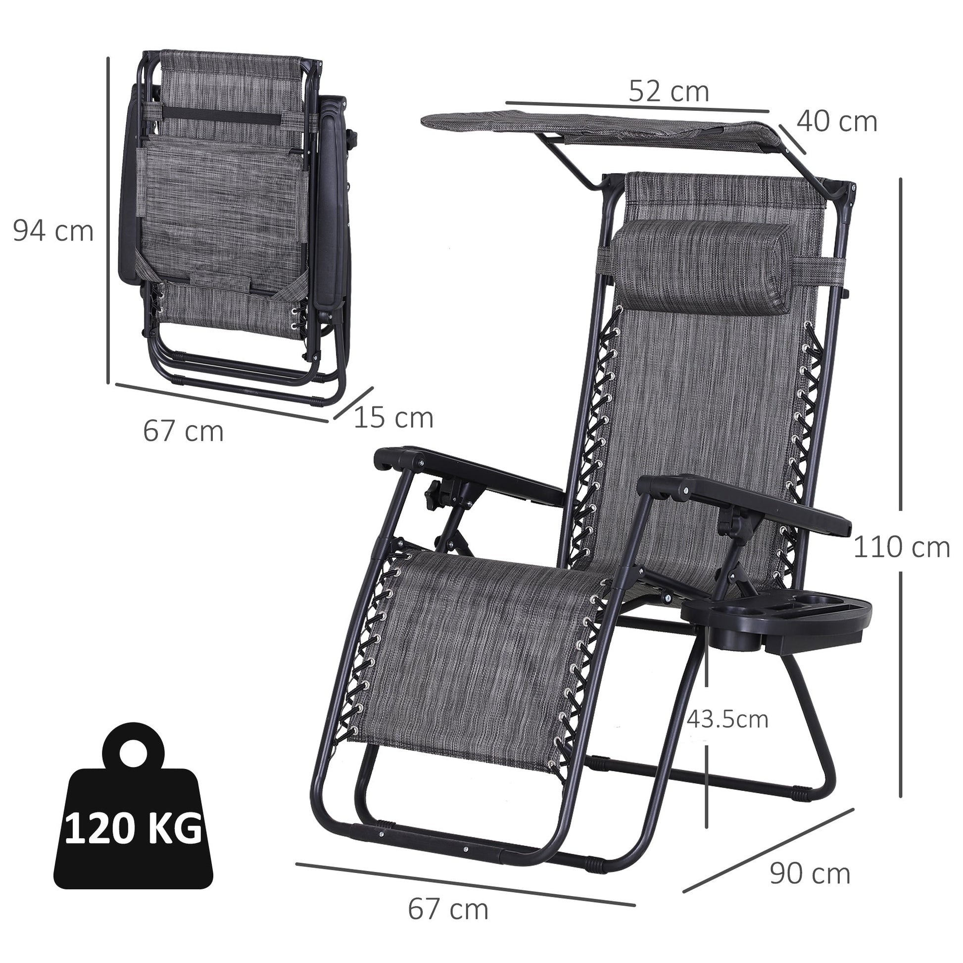 Outsunny Foldable Reclining Garden Chair with Headrest, Zero Gravity Deck Sun Lounger Seat Chair with Footrest, Armrest, Cup Holder & Canopy Shade, Grey