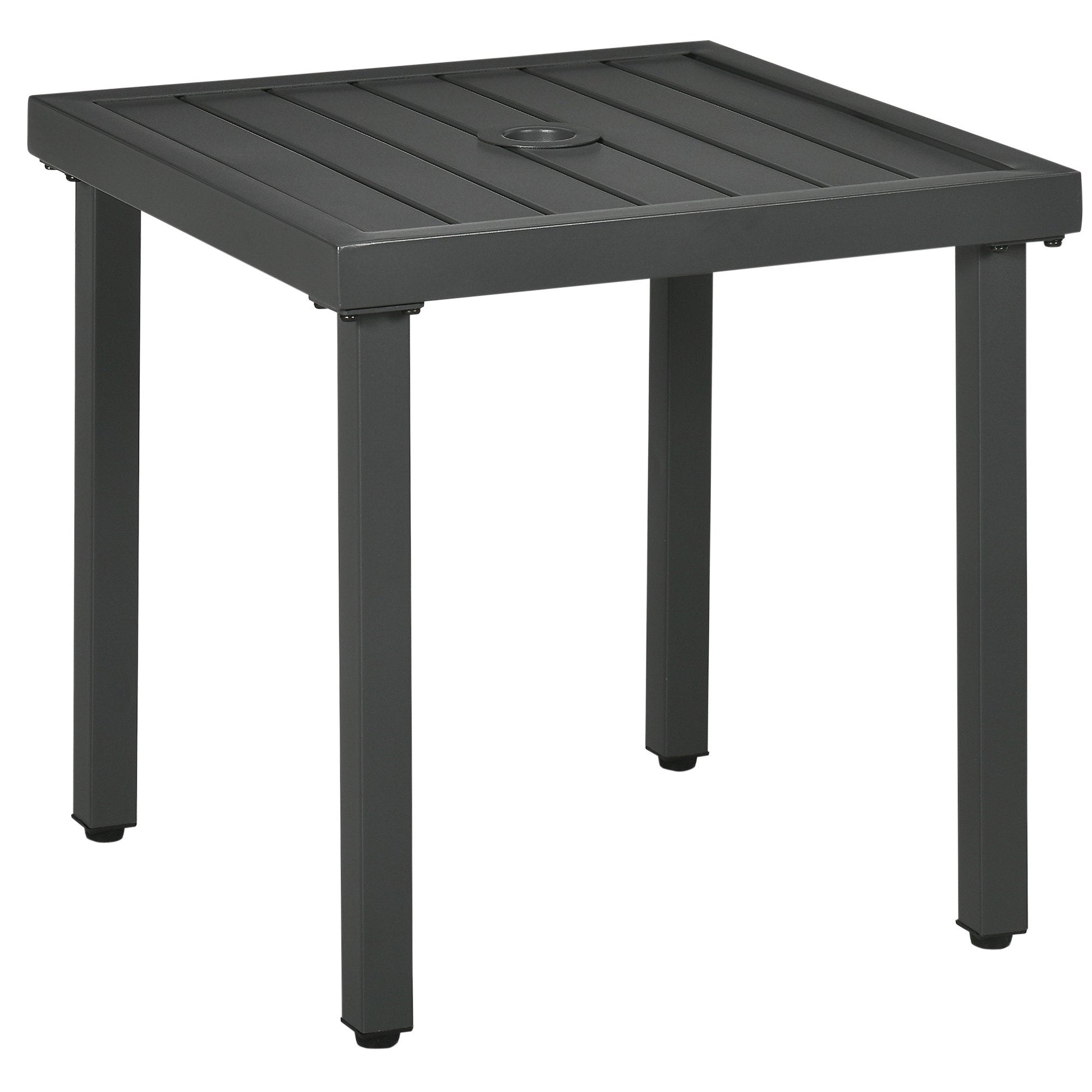 Keeping what you need, near outdoors. Look to this Outsunny square table. A powder coated steel frame makes the core strong. The tabletop features a â45mm umbrella holder - keep yourself shaded when needed. Complete with adjustable feet.