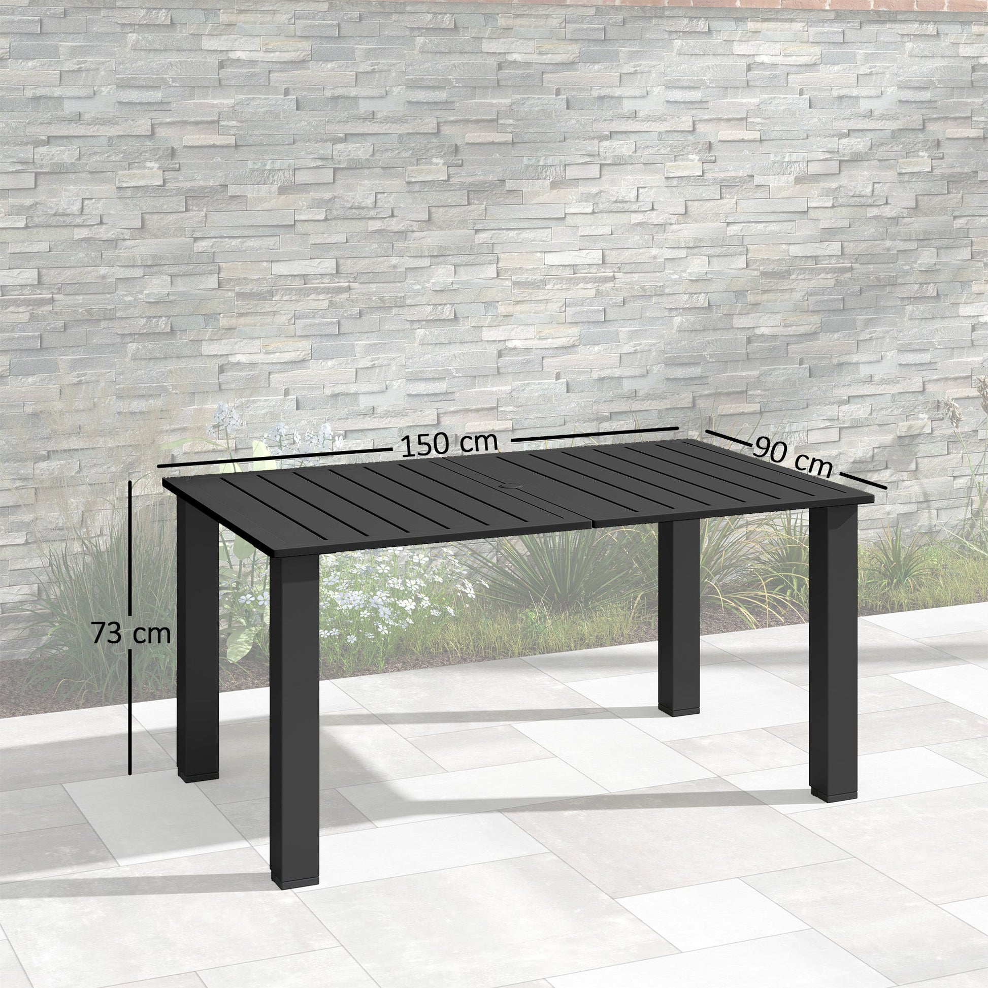 Outsunny Garden Table with Parasol Hole for 6 Person, Rectangle Outdoor Dining Table with Slatted Metal Tabletop, Steel Frame for Patio, Balcony, 150 x 90 x 73 cm, Black