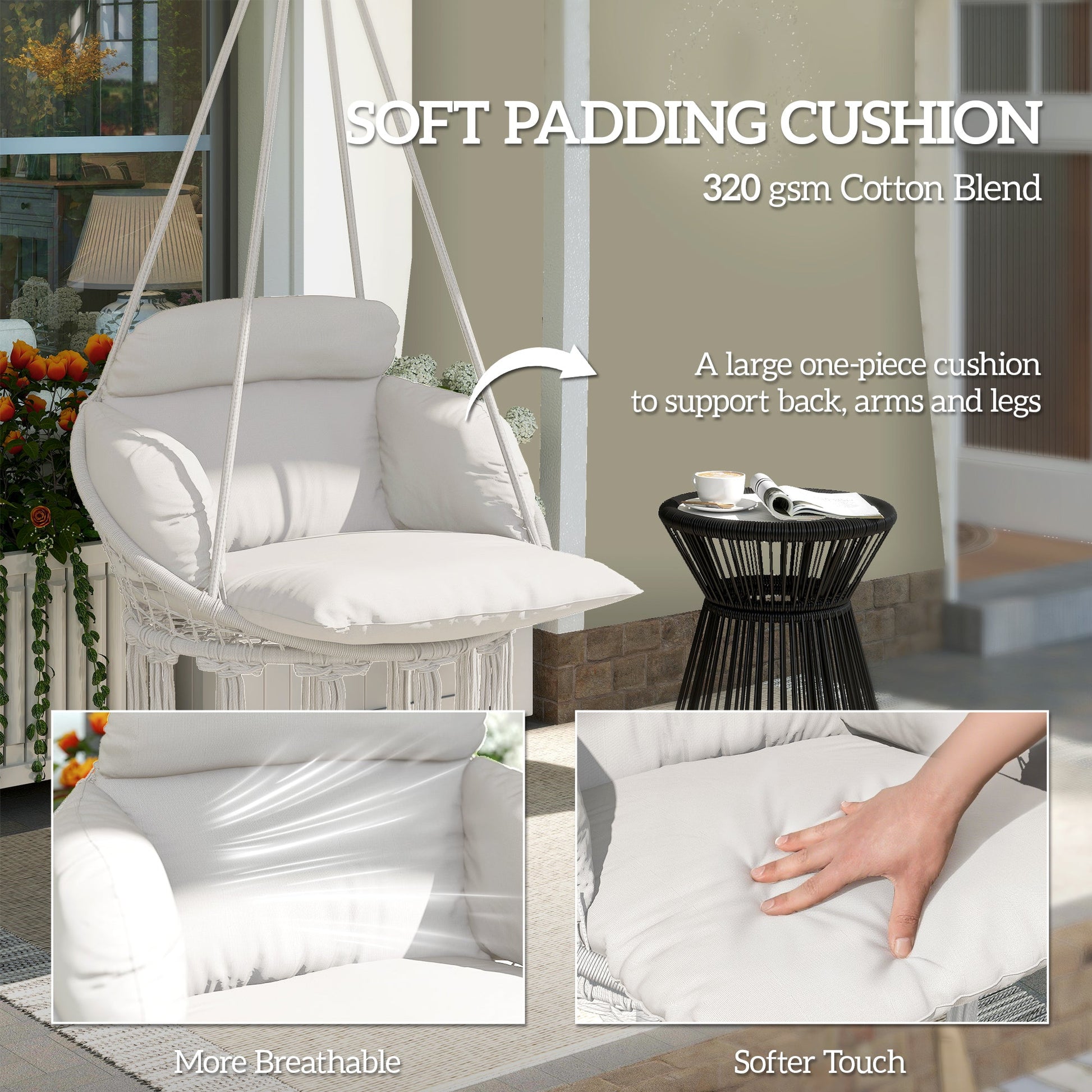 Outsunny Hanging Chair Outdoor Hammock Chair with Soft Cushion, Cotton Rope Boho Style Swing Chair, Hanging Garden Swing Seat for Indoor Outdoor, Cream White