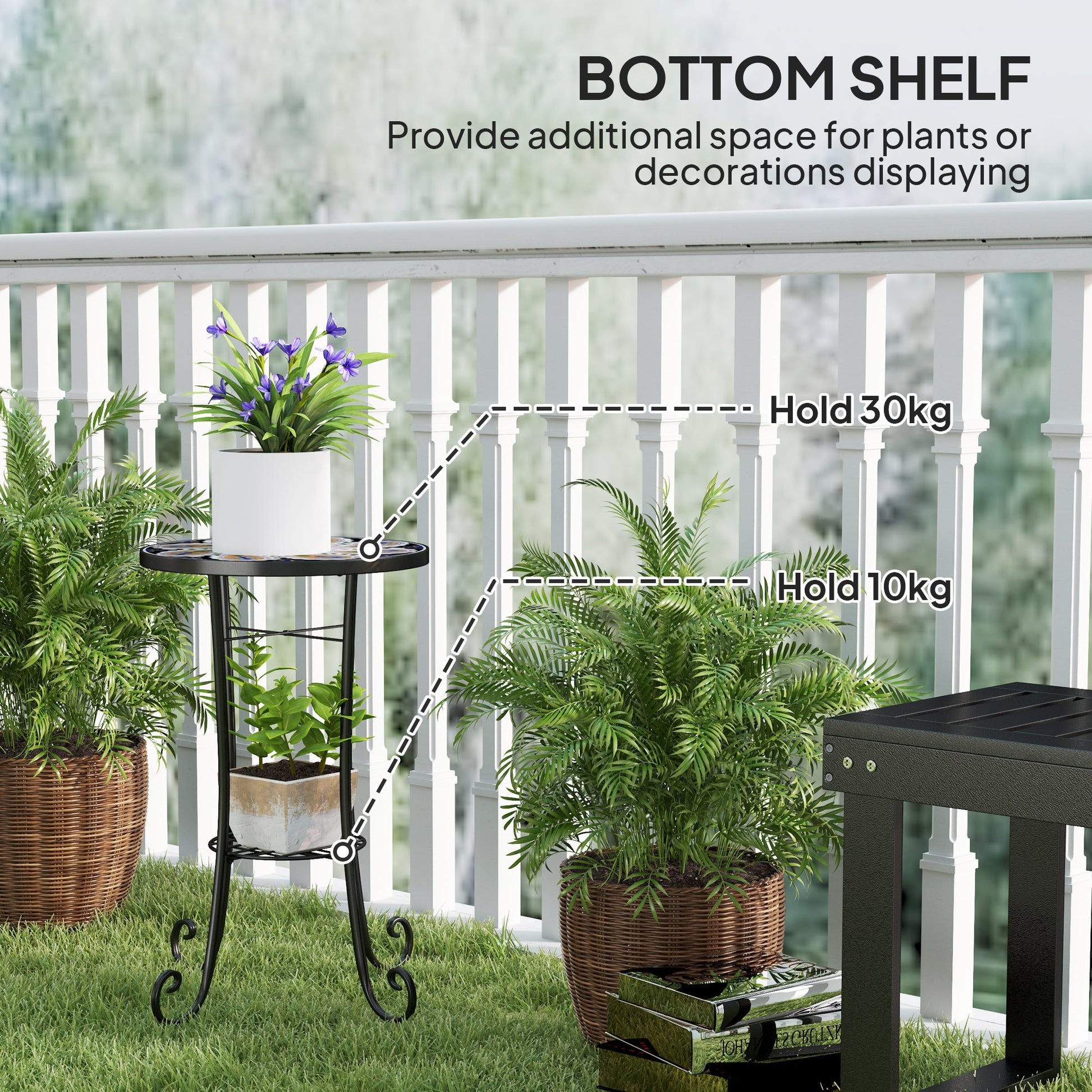 Add a splash of colour to your outdoor space with the Outsunny round garden table. This charming and striking patio table features a vibrant mosaic top and gracefully curved legs. With electrophoretic metal frames, this outdoor side table is strong to resistant water, weather and rust, complete with four legs for plenty of balance. It's not only a fetching small side table or bistro table but also includes a handy lower shelf for displaying plants or decorations.
