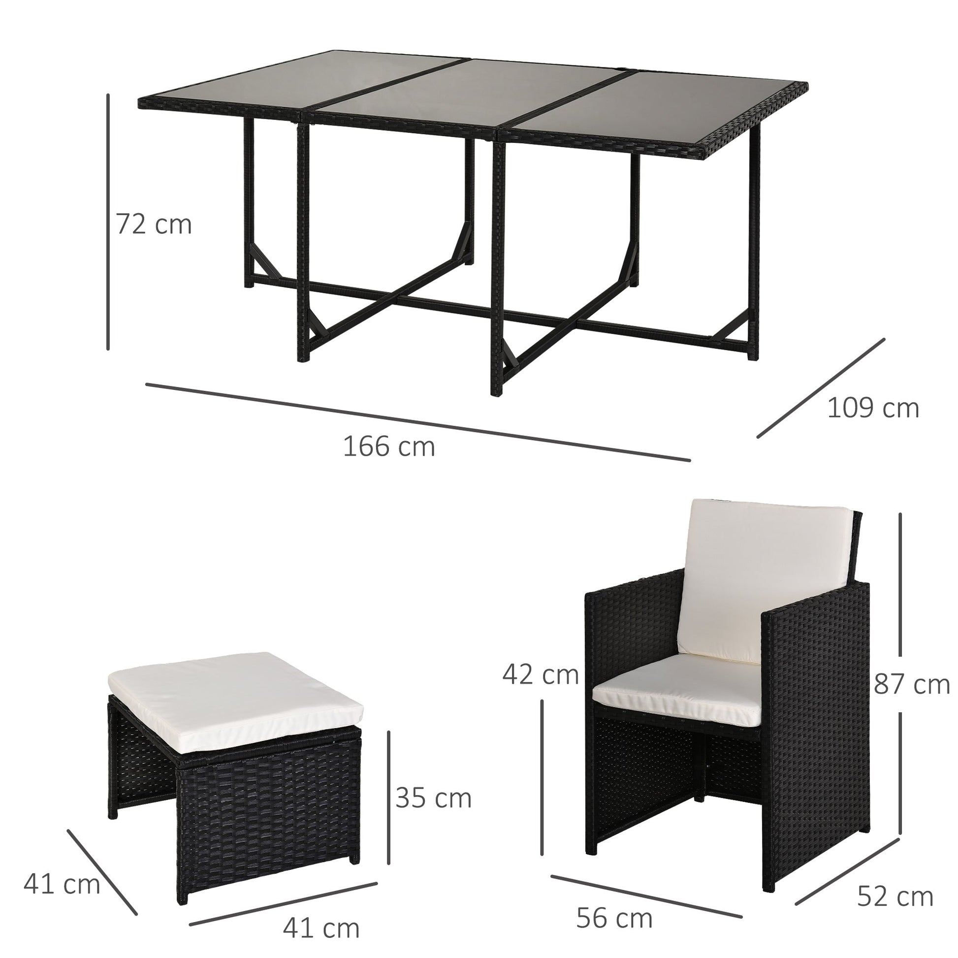 We do not ship to BT/Guernsey/ Jersey/ the Isle of Man/ Northern Ireland or call for shipping charge. This Outsunny brand rattan set has 6 chairs & 4 footstools which fit neatly under the glass top table to form a cube and each chair has a flip up, reclined back rest to provide far superior comfort. He set is made of a metal structure covered in PE rattan, the set comes with cushions for both the seating and the backrest. Cushion cover is removable and washable to give you a new look every time, and cleaning of the rattan can be done using a damp cloth. The table top is assembled and come complete with a 5mm tempered glass. An anti-UV explosion-proof membrane can withstand temperatures up to 80 degrees Celsius.The film is firmly bonded to the glass and can be used for 2 years. When the glass breaks, the fragments do not fall off the film.