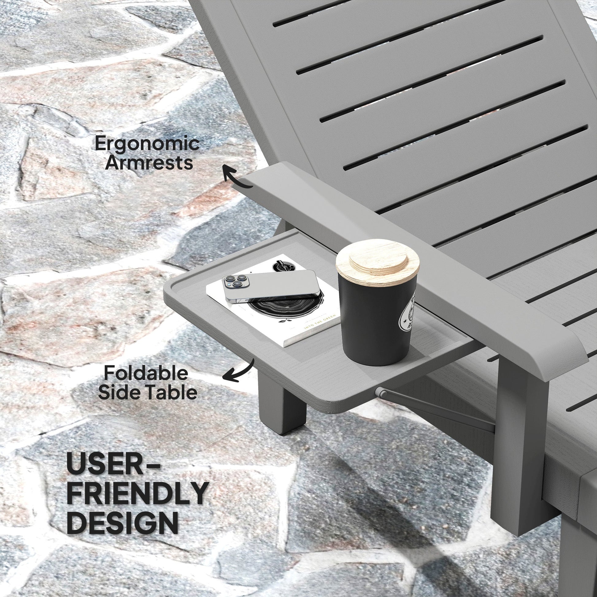 Outsunny Set of 2 Resin Reclining Sun Loungers for Garden, 5 Positions Adjustable Outdoor Chaise Lounge Chairs with Wood Texture Surface, Armrests, Foldable Side Table for Garden, Beach, Dark Grey