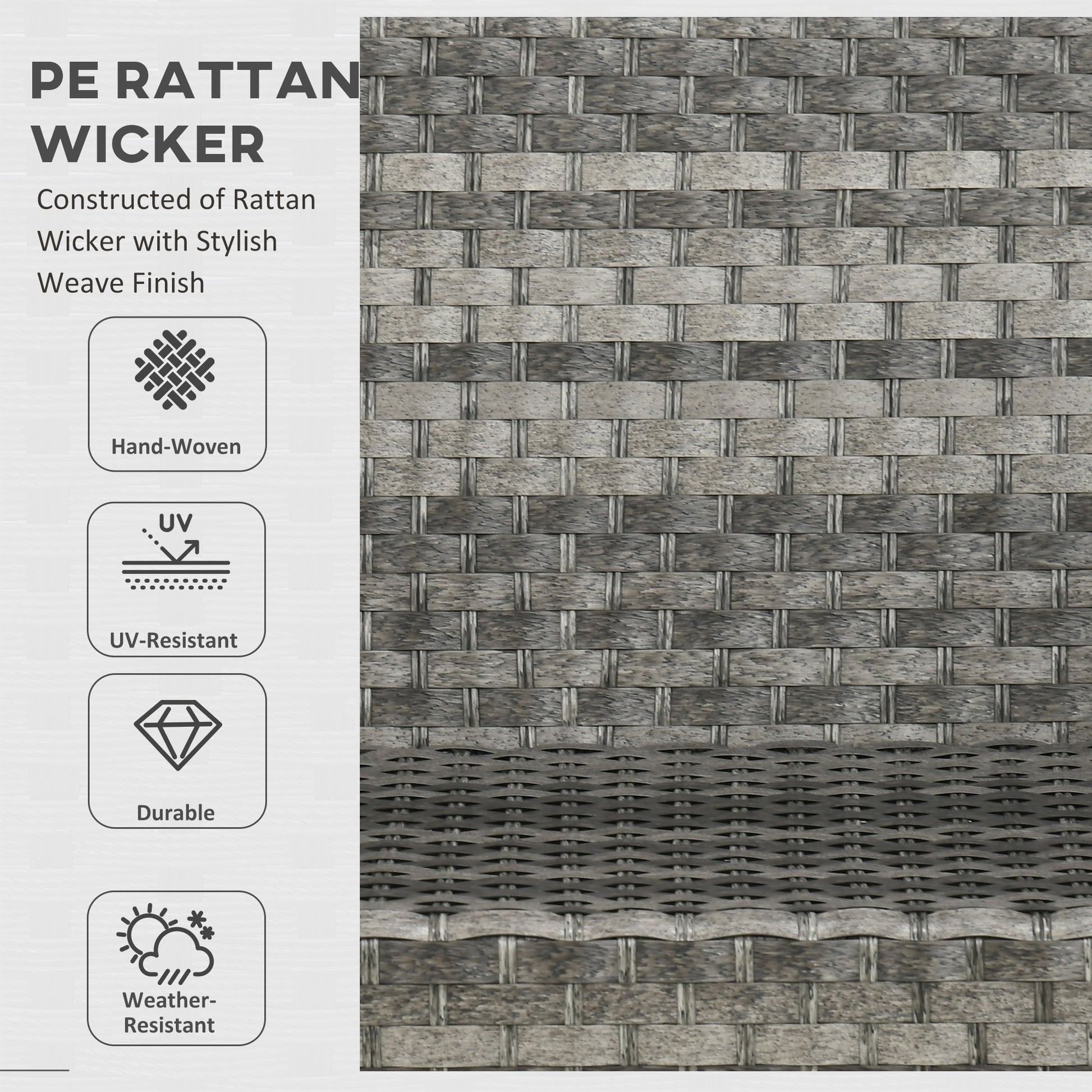 Relaxing evening times need never be cold again - do it in one with this Outsunny rattan set, with fire pit table. The two corner loveseats, standard loveseat, three footstools and matching fire pit table mean there's room for your favourites to gather round, with the table giving you somewhere to eat and drink from. In the middle of the table, there's a fire pit: provides up to 50,000 BTU power - plenty of heat for the colder climes. There's a wind guard for the fire, so you can keep peace of mind, at all times.
