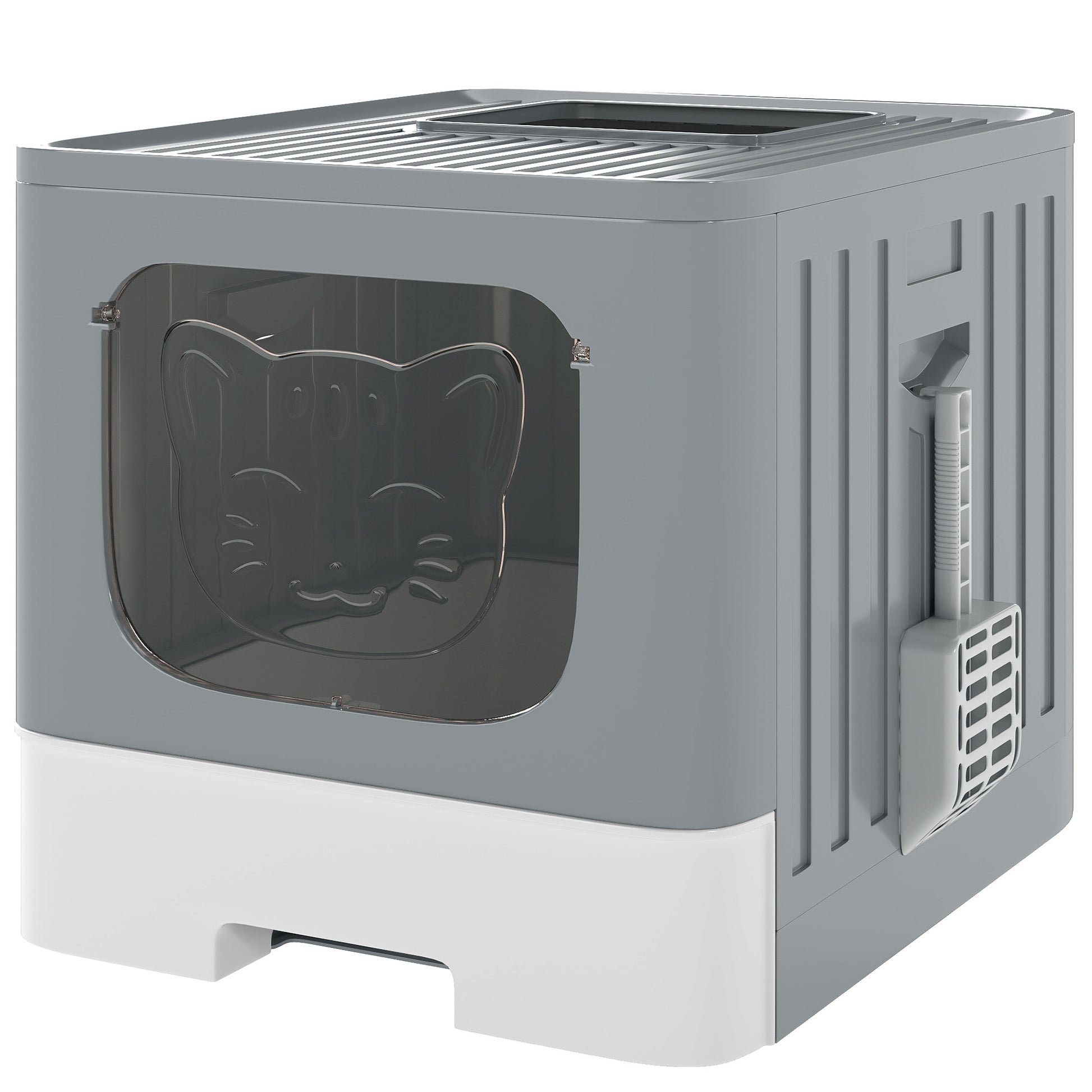 PawHut Foldable Cat Litter Box with Lid, Slide-Out Drawer, Scoop, Easy Clean, Odour Control, Anti-Splashing, Grey