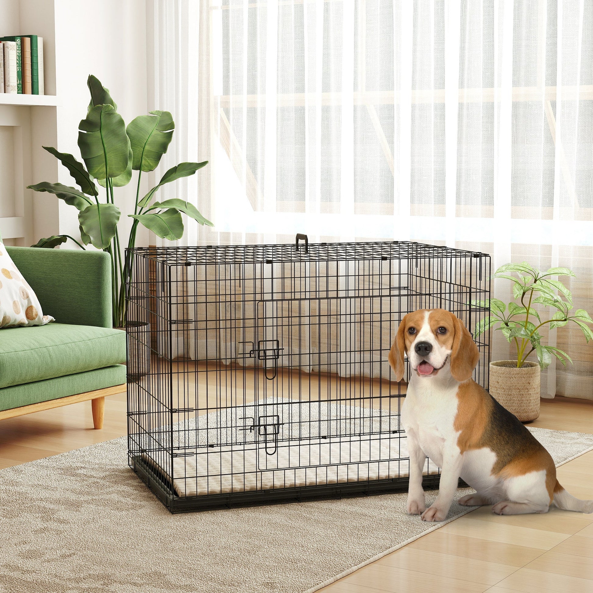 Crate training offers dogs security and gives you peace of mind. This PawHut dog crate is great for extra large dogs and below. It features a removable, washable cushion for comfort, an easy-to-clean tray for hygiene and a foldable design with a plastic handle for simple storage and transport. Suitable for training puppies, providing a safe haven for senior dogs or giving you a break, it simplifies life for both pets and owners.