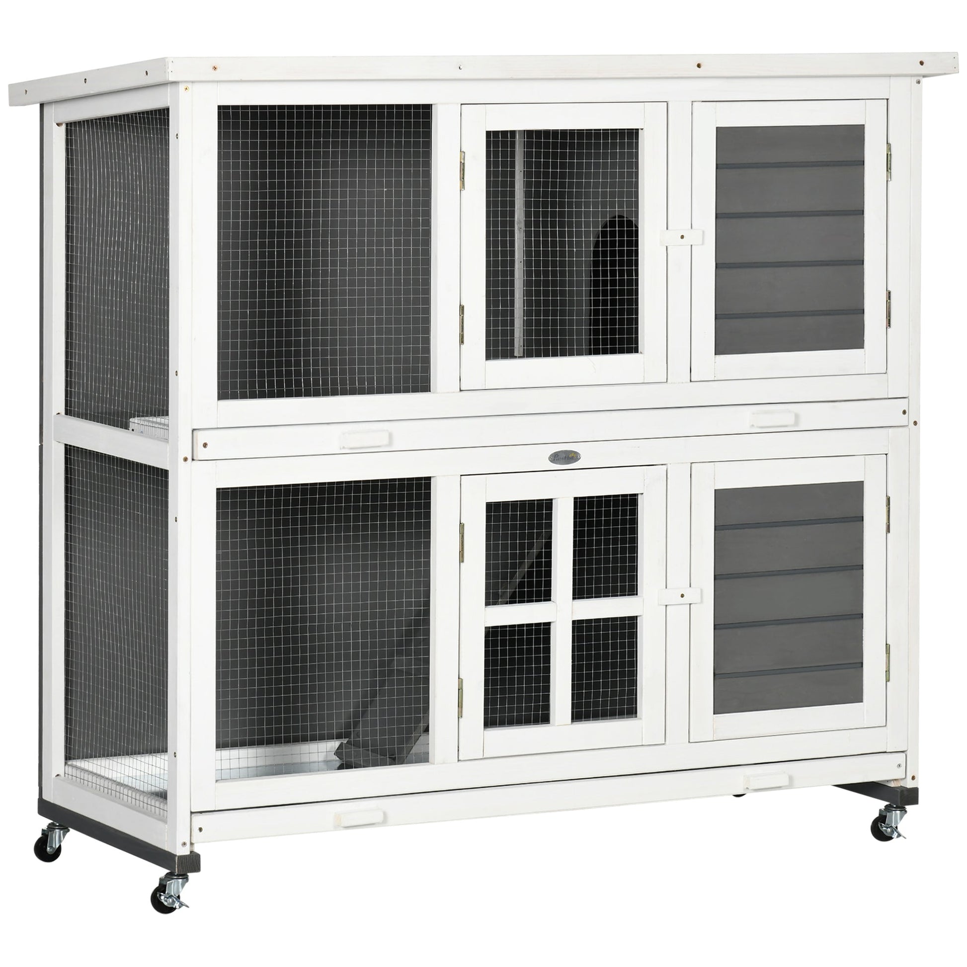 PawHut Wooden Rabbit Hutch, Two-Tier Guinea Pig Cage, with Removable Tray, Wheels