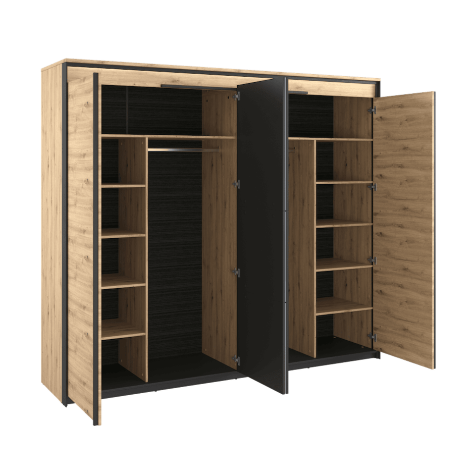 Elevate your bedroom with the Quant QS-05 Hinged Wardrobe, expertly crafted to provide ample storage without compromising on style. With its sleek oak artisan and black matt finish, this wardrobe seamlessly blends into any decor. Equipped with four hinged doors, two of which are mirrored, it not only maximises storage but also adds a touch of glamour with integrated LED lighting. Enjoy the perfect balance of practicality and elegance for your bedroom essentials.