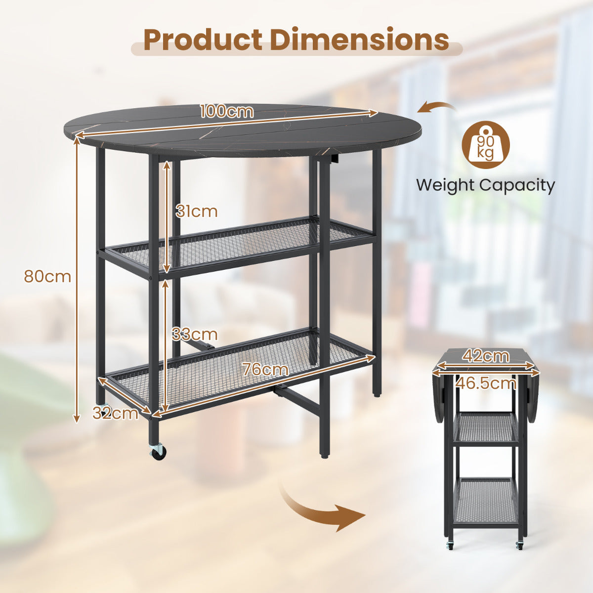 - Product Dimensions: 100 cm x 100 cm x 80 cm(L x W x H) Folding Dimension: 100 cm x 46,5 cm x 80 cm(L x W x H) Storage Shelf Dimension: 76 x 32 cm(L x W) Tabletop