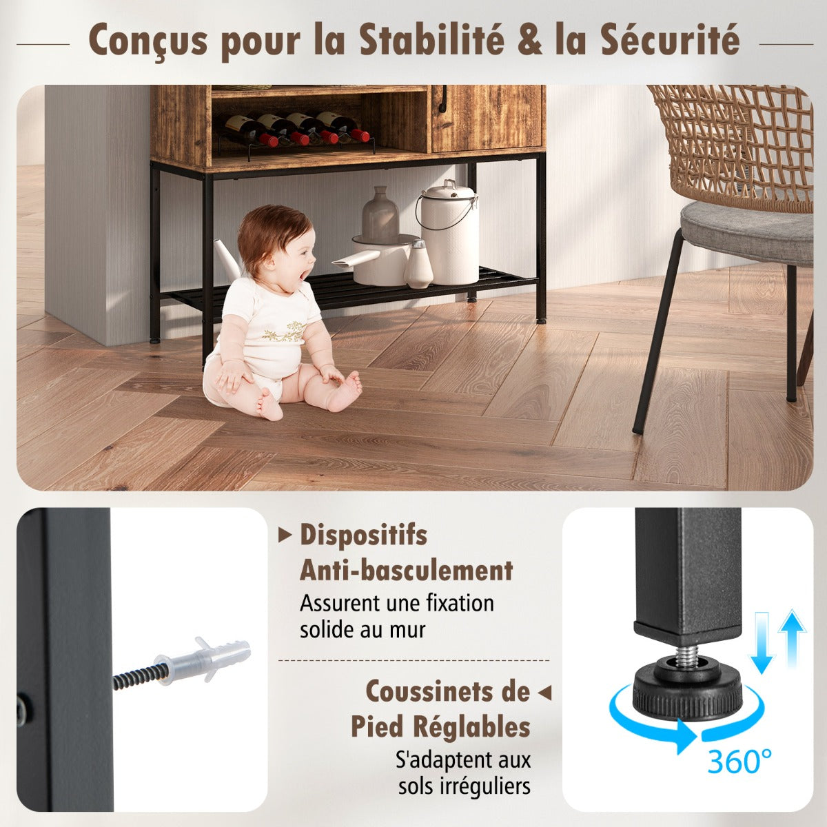 This versatile console table offers ample storage space for keeping essentials within easy reach, featuring removable wine racks for specified storage needs. The user-friendly handle allows for effortless opening of the door, while the magnetic door catch ensures secure closure. With a sturdy metal frame and adjustable foot pads, this sideboard provides stability and reliable support. For added safety, anti-toppling devices are included. Whether placed in the kitchen, dining room, living room, or entryway, this buffet sideboard table is a fantastic addition to your home. If you are looking for such a product, do not hesitate to buy it! Diverse Storage Areas: The coffee bar cabinet features removable wine racks that will hold 4 wine bottles. Moreover, the cabinet with door and storage shelves offers more storage options for your home appliances, storage baskets, ornaments, etc. Stable Construction: Supported by a heavy-duty metal frame, this console table boasts exceptional durability and stability. The adjustable foot pads adapt to uneven grounds for enhanced steadiness. Anti-toppling Devices: For added peace of mind, this kitchen storage cabinet is equipped with anti-toppling devices that securely attach it to the wall, preventing any risk of tipping over and ensuring the safety of your family. Designed for Versatility: This sideboard table features retro wood grains that impart a timeless touch to your house. As a good combination of practicality and aesthetics, it serves well in the kitchen, dining room, living room, entryway and other places. User-friendly Features: Thanks to the convenient handle, you can have easy access to the items stored behind the door. Additionally, the magnetic door catch helps close the door firmly for better protection.