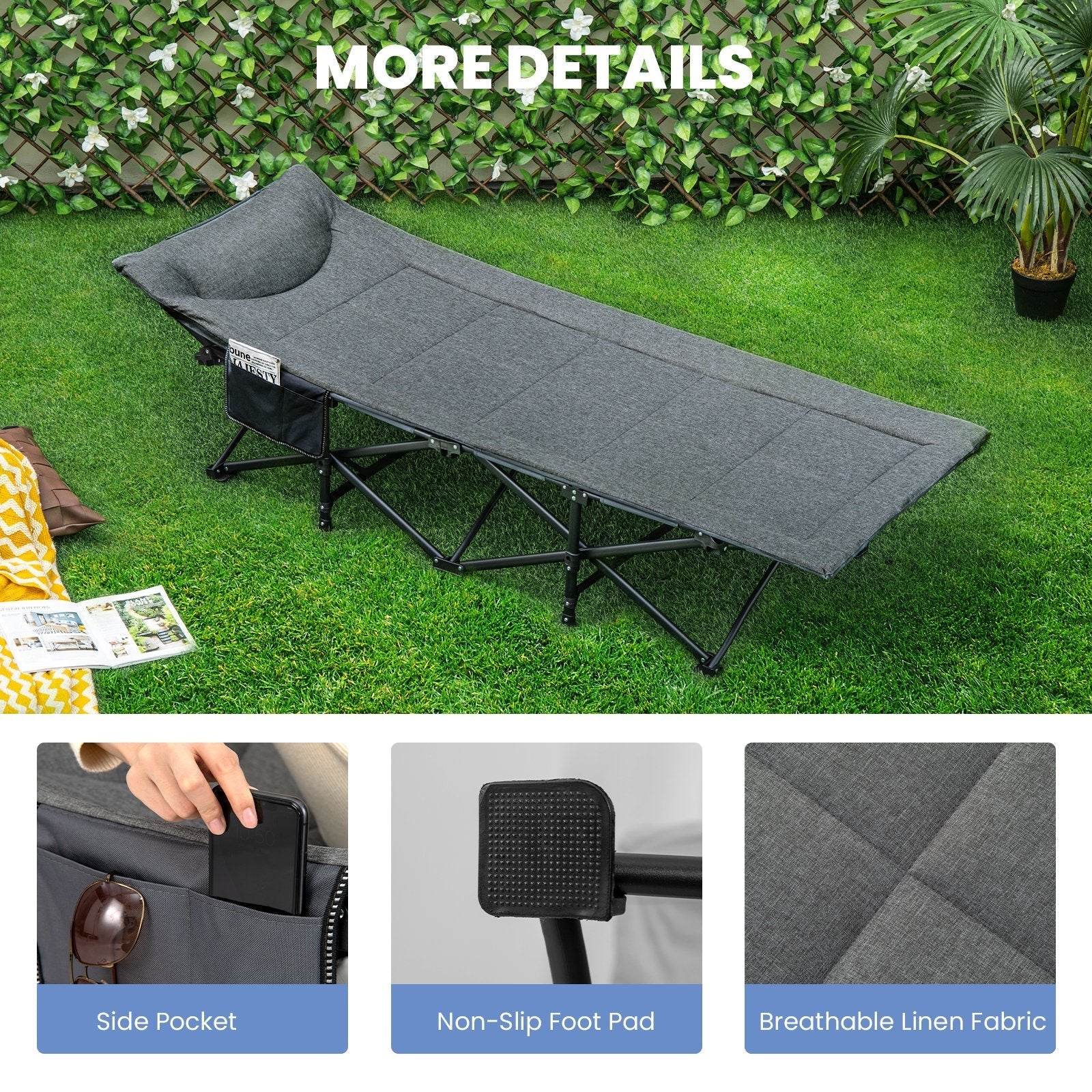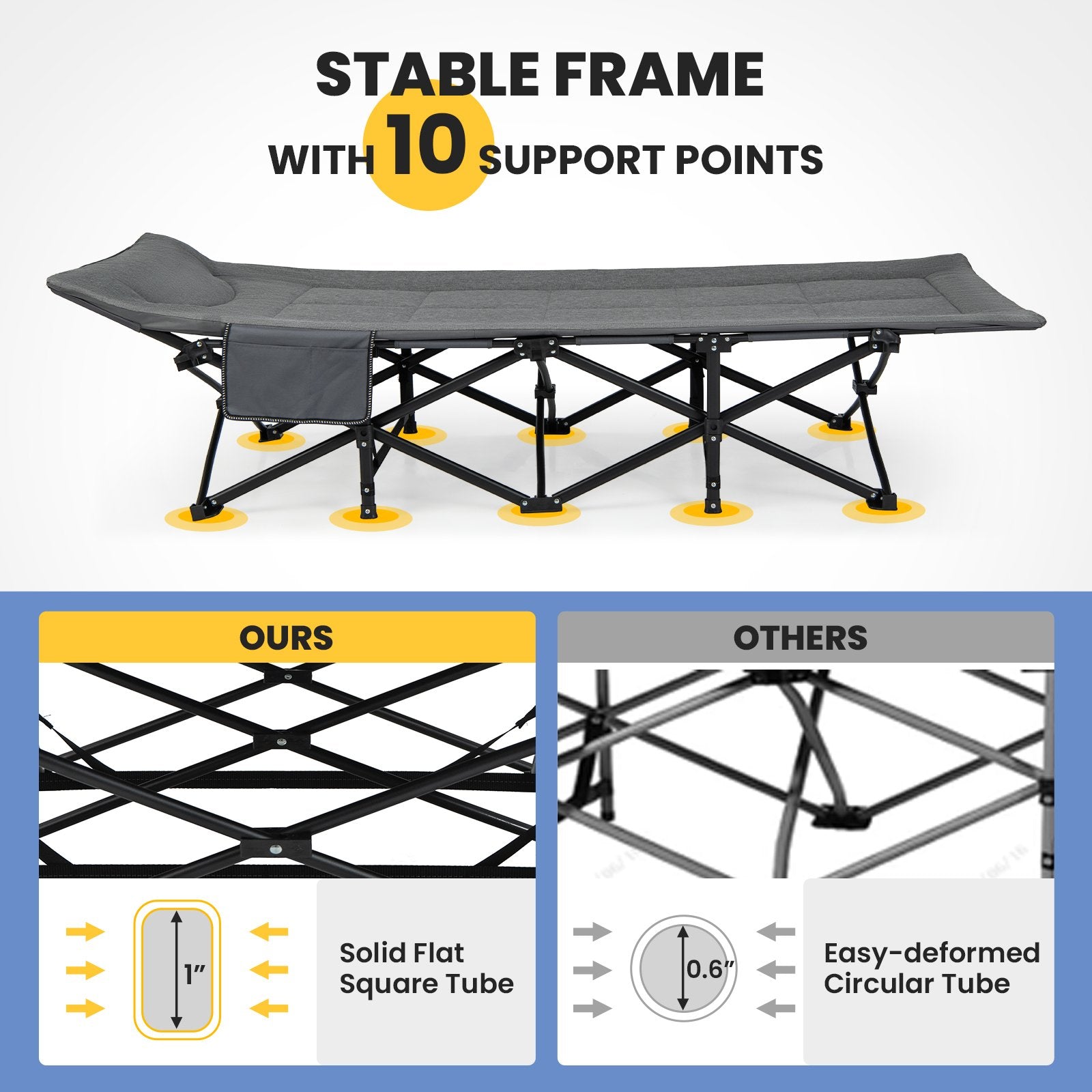 Get a better night's sleep during your next camping trip or beach outing with this stable frame camping cot from a top-quality brand! Its metal frame and ten support points offer superior comfort and stability for a peaceful rest, while its lightweight and folding design makes it easy to take with you wherever you go. The super comfortable headrest design is padded with PP cotton filling and soft linen fabrics for ultimate breathability and ventilation. Plus, it requires no assembly and folds and unfolds quickly, making it the perfect sleeping solution for people on the go. Order yours today and enjoy a comfortable encounter with the great outdoors! If you are looking for a camping cot like this, do not hesitate to place an order! Stable Frame with 10 Support Points: Featuring a stable metal frame and ten support legs with non-slip foot pads, this camping cot is perfect for a peaceful rest without any instability or wobbling. Besides, the 2.5 cm solid flat square tube is more strong than other 1.5 cm easy-deformed circular tubes. Super Comfort Headrest: The super comfortable headrest design has been crafted for a peaceful night's rest. The headrest is padded with ultimate comfort PP cotton filling, and the soft linen fabrics provide superior breathability and ventilation, allowing you to sleep soundly. Premium and Durable Fabric: This camping cot makes the breathable linen fabric surface and wear-resistant Oxford bottom into one, which is durable and comfortable to use. It is suitable for long-time use and ideal for camping trips or beach outings. Multi-scene Use: This camping cot is incredibly versatile and suitable for any situation! Whether you're looking for a place to nap in the living room or the office, or a comfortable bed while camping, this camping cot caters to all. Plus, it folds quickly, making transportation and storage effortless. Easy Folding Design: With no assembly required, this camping cot is incredibly user-friendly! It folds and unfolds in just seconds, saving you time and effort. Additionally, its large size and side pocket provide ample room for your belongings, making it the ultimate sleeping solution for people on the go.