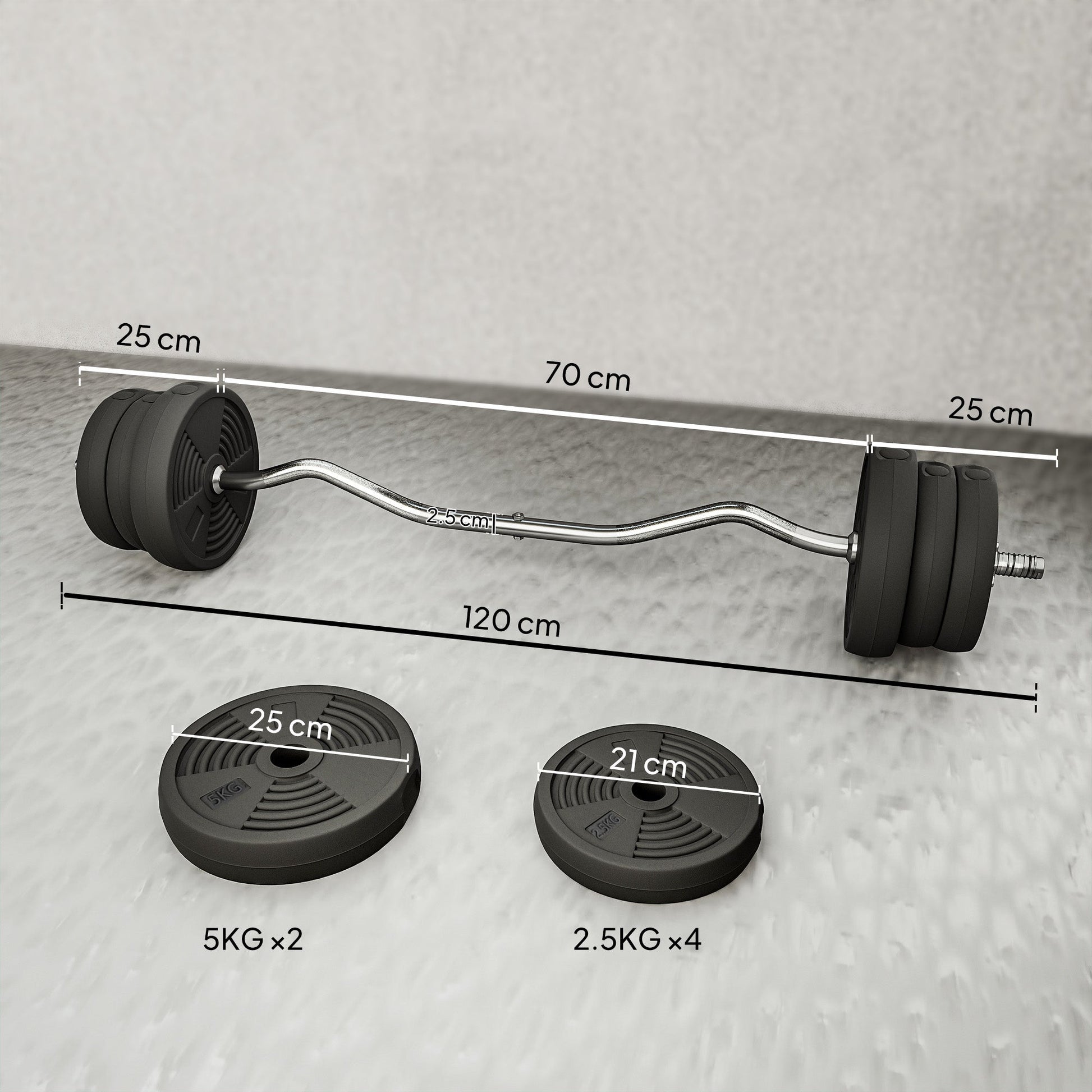 - Dimensions: Փ25 x 120Lcm. 5kg plate: Ф25 x 5Dcm. 2.5kg plate: Ф21 x 4Dcm