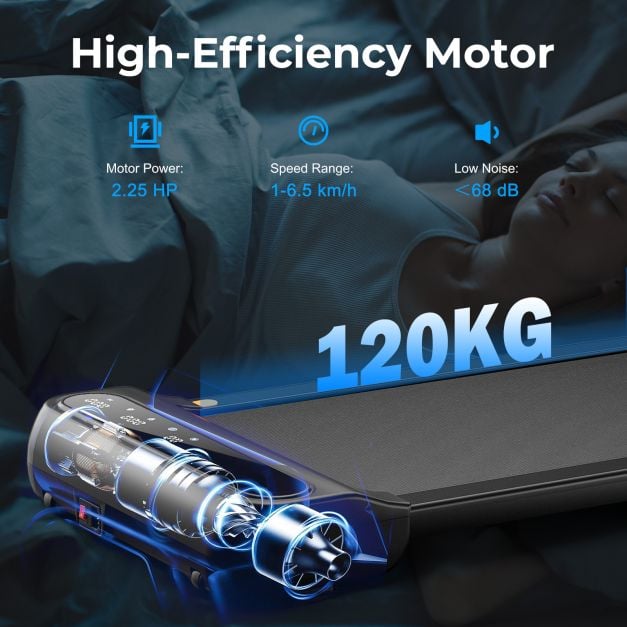 Whether you want to incorporate a light walk into your workday, this walking pad is a convenient and efficient fitness solution for busy individuals! Vary from normal under desk treadmills, it features a watch-like remote control and LED touch screen, making operation much easier. The LED touch screen feedbacks your exercise data in real time. And the watch-like remote control allows for seamless adjustments without having to reach down to the treadmill. One of the highlights of this walking pad is the pause function. Press the "Start/Pause" button, your exercise data will remain on the LED touch screen. So you can have a water break. No matter whether you want to walk or jog, this portable desk with 0.5-4 MPH speed range, 3 countdown modes and 12 preset programs always meets your needs. During exercise, the 7-layer running belt and 14 shock absorbers endow this walking pad with a safer surface and better cushioning performance. And the 2.25 effective yet quiet motor allows you to use this portable walking treadmill in your home or office. When today's exercise goal has been met, you can push this walking pad to the desired place and store it for space-saving. 7-layer Running Belt and 14 Shock Absorbers: This walking pad features 7 layers running belt, 2 large soft rubber pads and 12 shock absorbers, which not only make the running belt anti-slip for safety, but also bring better cushioning for your knees and ankles. Dual Operation with Pause Function: The LED touch screen facilitates easier operation while clearly showing your exercise data, such as speed, time, distance and calorie. And this under desk treadmill accepts watch-like remote control as well. Both control methods come with a pause button to keep data all the time. 0.5-4 MPH Speed Level and 12 Preset Programs: This 2-in-1 under desk treadmill is suitable for walking and jogging thanks to the 0.5-4 MPH speed range. And 12 preset programs and 3 countdown modes (time/distance/calorie) are also included to make exercise more challenging. 2.25HP Motor and 265 lbs Capacity: The 2.25HP motor endows this walking jogging machine with high efficiency and low noise operation (<50dB), giving you an effective workout without disturbing others. And the 265 lbs max load makes this walking pad fit most users. Installation Free and Easy Movement: When you receive the package, just unbox and plug in the 6 ft power cord. This under desk walking pad is ready to use. Besides, the 2 smooth wheels allow you to move it easily. And the 5 inches thickness facilitates easy storage for space-saving.