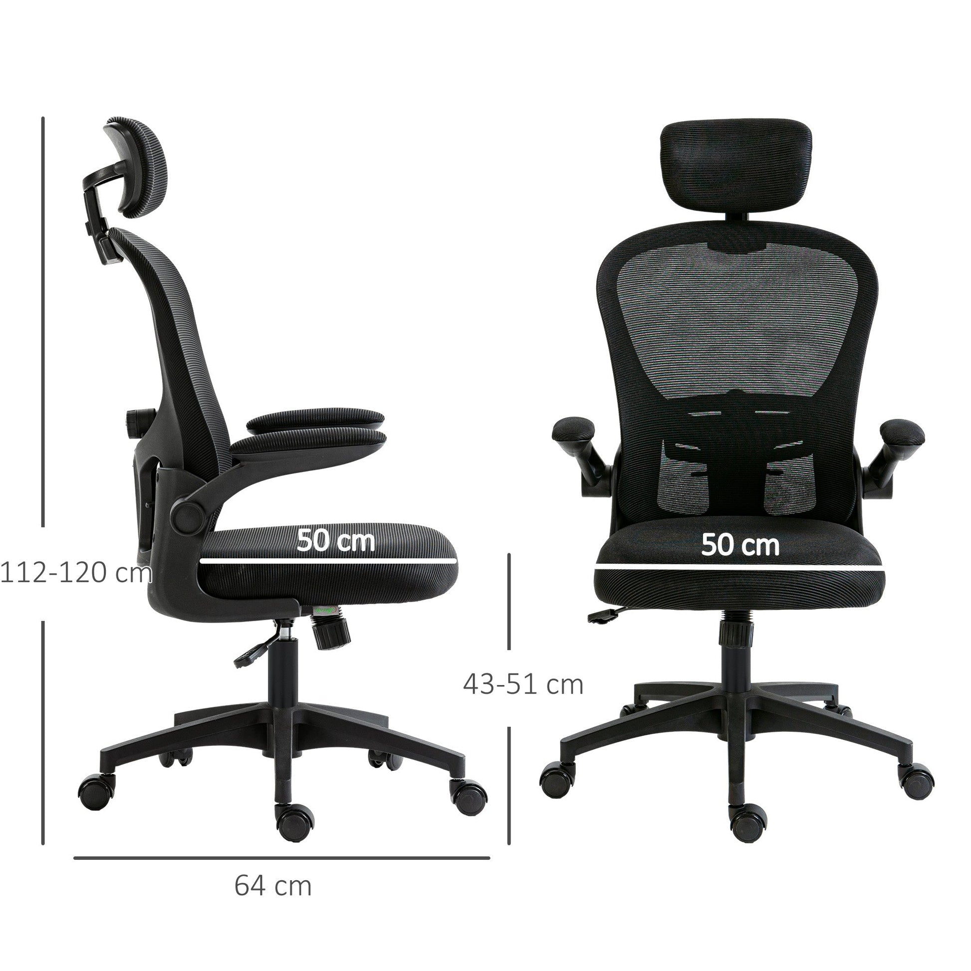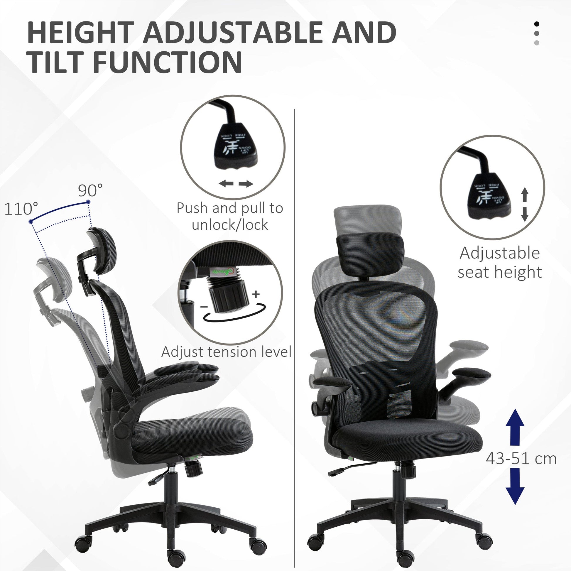 Adjust office comfort your way. This Vinsetto chair comes in a fully flexible design: look to the lumbar support which moves up/down and forwards/backwards, along with the headrest which rotates and moves up/down; pair this with the adjustable tension and 43-51cm seat height. It's comfortable too, thanks to the padded seat and mesh back. Complete with five wheels, this swivel chair moves around easily.