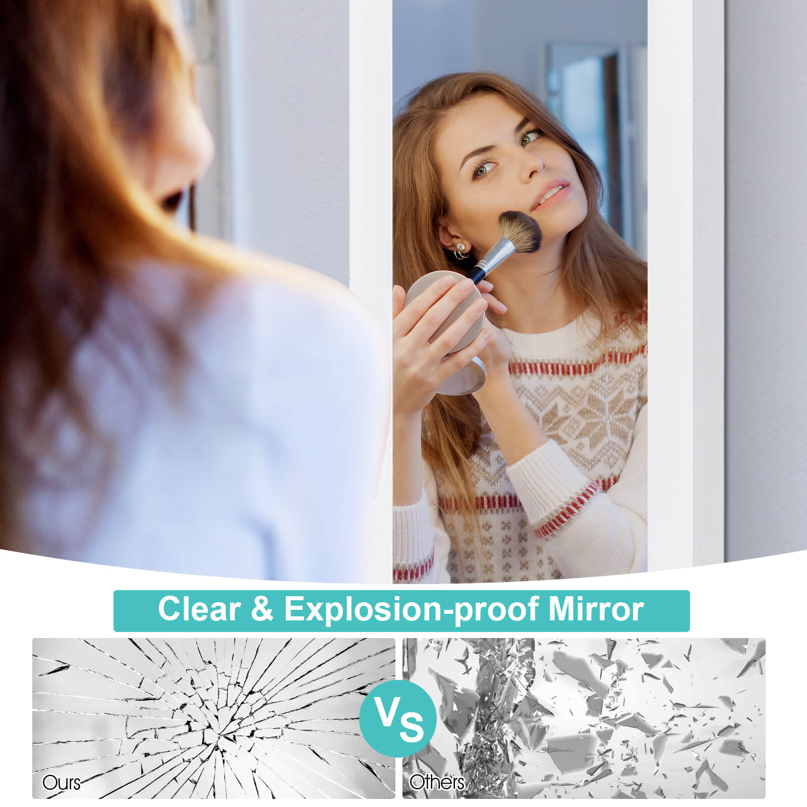 This 2-in-1 luxurious and functional mirror jewelry armoire will be a perfect addition to your home! Equipped with multiple compartments, this jewelry cabinet can organize all your jewelry and cosmetics in one place, including necklaces, rings, earrings, bracelets, sunglasses, watches, lipsticks, etc. The full-length mirror offers you a head-to-toe view of your outfit, while the built-in small mirror is convenient for you to make up and select jewelry. Moreover, made of real glass, the mirrors both have high definition imaging without distortion. The thick and durable MDF frame ensures stability and long-lasting use. What's more, this mirror jewelry cabinet can be easily hung on the door with 2 hooks or fixed on the wall with screws based on your preference. If you are looking for a Jewelry Armoire like this, do not hesitate to place an order! Keep Your Jewelry Well Organized: This jewelry armoire features a compact design yet offers ample storage and display space for your jewelry and makeup. There are 6 lined shelves for holding earrings (84 earring slots and 78 earring holes), 25 hooks for necklaces and bracelets, 40ring slots and 3 storage shelves. Full-length Mirror and Makeup Mirror: This wall mounted jewelry cabinet is equipped with a full-length mirror which has a clear reflection and provides a wide view for you to check your outfit from head to toe. Meanwhile, there is a small mirror inside the cabinet, enabling you to try on jewelry or check your makeup more conveniently. 2 Ways of Installation Available: You can mount this jewelry organizer cabinet on the wall with the included wall-mounted kit or hang it over the door with 2 hooks. What's more, both of these installation ways can save plenty of floor space and make it easy for you to place the jewelry cabinet anywhere in your bedroom, closet, living room, etc. Premium Material and Thoughtful Design: Made of high quality MDF and glass, this door hanging jewelry cabinet ensures great stability and durability. The magnetic door catch and smooth metal hinges allow you to open and close the door with ease. Besides, the soft velvet lining can protect your jewelry from scratching and wearing. Hassle-free Assembly and Maintenance: The jewelry cabinet body is pre-assembled for a worry-free setup. With the detailed instruction and complete accessories, you can install this jewelry cabinet with ease. Moreover, the smooth surface of the cabinet is sprayed with paint for easy cleaning with damp cloth.