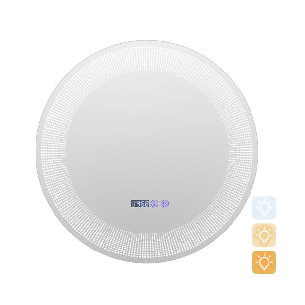The LED lights offer 3 color temperatures with adjustable brightness, allowing you to choose between warm, natural, and cool light to suit your preference. The built-in defogger quickly clears any condensation, providing a clear and fog-free reflection even in the steamiest of bathrooms. And control your mirror with ease using the smart touch control panel. Constructed with high-quality materials, this mirror is made of copper-free silver mirror with an explosion-proof film, ensuring safety and durability. With IP44 rating, this bathroom mirror is safe and durable for long-time use. The sleek and modern design complements any bathroom style, adding a touch of sophistication to your space. If you are looking for a Vanity Makeup Mirror like this, do not hesitate to place an order! Adjustable Lighting Option:You can enjoy the flexibility of 3 color temperatures (3000K warm, 4750K natural, 6500K cool) with 20%-100% adjustable brightness settings. Plus, the built-in memory function will make it retain your last-used lighting settings. Defogging Function:Say goodbye to fogged-up mirrors after a hot shower. This bathroom mirror is equipped with a fast and safe defogging function that keeps the surface clear and ready for use at all times. The defogging function will auto shut off after continuous operation for 60 mins. Smart Touch Control andLED Display:Time/temp display: long press “Defog”button to adjust the number of minutes and clocks. Defog button: short press to start heating and defogging. On/off button: short press to adjust the light color, long press to adjust the brightness. Safe andDurable Construction:This copper-free silver mirror is made with an explosion-proof film for added safety and durability, without splashes when accidentally breaking. IP44 tested, this bathroom mirror can be purchased with confidence. Stylish Wall-Mounting Mirror: The radial LED lights and high-definition mirror with a frameless design add a touch of sophistication, transforming your bathroom into a stylish oasis. The package includes accessories for wall mounting. There are 2 connection options: plug-in or hardwired to use the wall switch.
