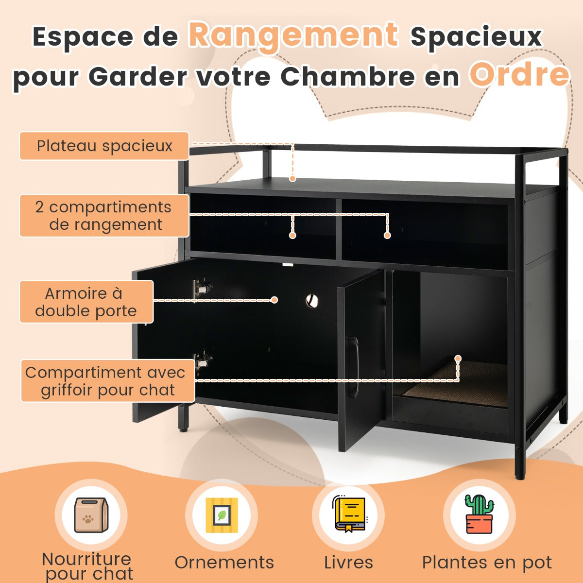 The litter box enclosure features ventilation holes and double doors that provide ventilation and privacy, making it the ideal place to hide your cat's litter box. Besides, there is an entry between the cabinet and the shelf for easy access to the cat scratch pad placement compartment. Meanwhile, its spacious table top and 2 compartments provide ample space for storing some of your daily necessities. Therefore, the litter box enclosure is a perfect laundry storage cabinet and living room side table. Private and Ventilated Cabinet: With an interior space of 52 x 43 x 37cm, the double door cabinet of the cat house is the ideal place to hide the litter box, as well as provide privacy. And the cat washroom features an inner entry to provide easier access to the next shelf. Besides, there are 3 large holes in the back panel to facilitate air circulation and prevent odor.Abundant Storage Space: Coming with diverse storage space, the hidden litter box enclosure will help you sort items and organize messy rooms. The guardrails-protected tabletop allows you to display decorations without falling. Besides, 2 compartments and cabinets are suitable for your favorite magazines, pet litter box, or other pet supplies.Safe and Stable Construction: Reinforced with a rust-proof painted metal frame, the industrial-style cat house has greater stability and can hold a total of 90kg of weight. And the adjustable feet on the bottom allow the cat cabinet to remain stable on uneven floors. What's more, the product features an anti-tip device to prevent the cabinet from tipping over and injuring your pet or child.Functional Cat Scratch Pad: To save your furniture, the litter box enclosure is equipped with a thick and abrasion-resistant cat scratching board that will sharpen your cat's claws for a long time. With this removable scratching board, you can easily clean the litter off your cat to avoid staining the floor or remove it to clean the inside of the cabinet.Versatile Decor for Multiple-scene: The classic industrial style design of this large cat house makes it not only an ideal place for small pets to sleep and play, but also elegant furniture to complement your laundry, living room, entryway, front porch, which can be used as a side table or storage cabinet according to your preference.