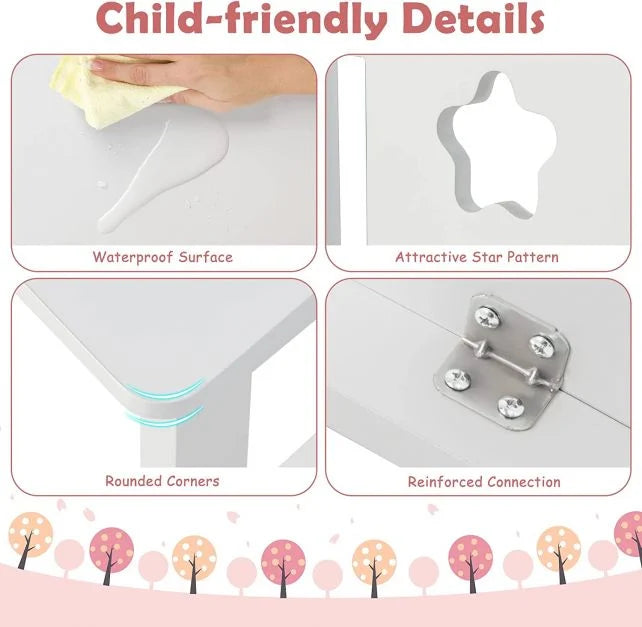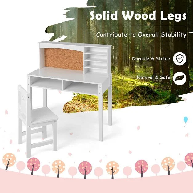 Give kids a great study area with our kids desk and chair set! The study writing desk and chair set has a 4-tier storage shelf and 2 open drawers, providing rich space for books, stationery and other items. Moreover, the wide desktop is suitable for learning, playing, drawing, eating, etc. And the cork bulletin board allows your kids to pin notes or display photos. In addition, the simple appearance caters to kids’ preference and blends with different home styles. Wide and Smooth Desktop: The wooden children's desk features a spacious desktop that offers kids enough space for a variety of activities. They are able to read, write, eat, do crafts or play games. Furthermore, the rounded corners and burr free surface are safe for children to use.Sturdy Solid Wood Legs: The kids' desk and chair are supported by solid wood legs. The sturdy pine wood contributes to overall stability so that the student's study table and chair stand stably. And the natural and safe materials are conducive to kids’ health.Sufficient Storage Space: The 4-tier storage shelves allow children to classify their items. What’s more, the cork bulletin board provides space to pin pictures or notes. And the 2 open drawers will accommodate plenty of objects like books and stationery.Perfect Gift for Kids: This wooden kids table and chair are polished into rounded corners, which is ideal for children over 3 years old. It can help kids to cultivate the ability of organizing and develop a good sitting habit at an early age.Easy Assembly and Clean: Coming with a clear and illustrated instruction, the kids table and chair set can be assembled easily. When it comes to daily cleaning, the smooth and waterproof surface permits you to wipe it with a soft rag.