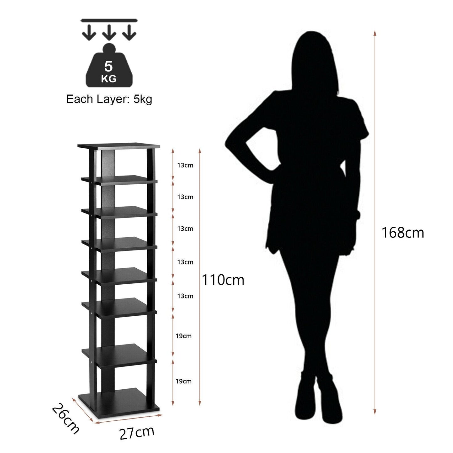 Colour: Black Material: Premium MDF board Overall dimension: 27 cm x 26 cm x 110 cm(L x W x H) Night weight: 7 kg Weight capacity per shelf: 5 kg Box Qty:1(May vary by batch)Package includes: 1 x Shoe rack 1 x Instruction manual